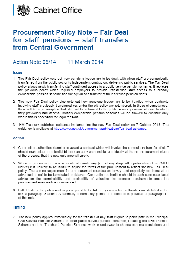This is the most recent Procurement Policy Notes (PPN 05/14) to be issued by the Cabinet Office which outlines fair deal for staff pensions – staff transfers from Central Government.