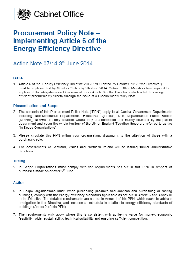 This is the most recent Procurement Policy Notes (PPN 07/14) to be issued by the Cabinet Office which outlines Implementing Article 6 of the Energy Efficiency Directive.