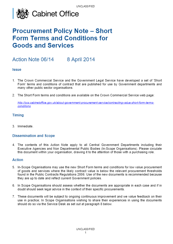 This is the most recent Procurement Policy Notes (PPN 06/14) to be issued by the Cabinet Office which outlines – Short Form Terms and Conditions for Goods and Services.