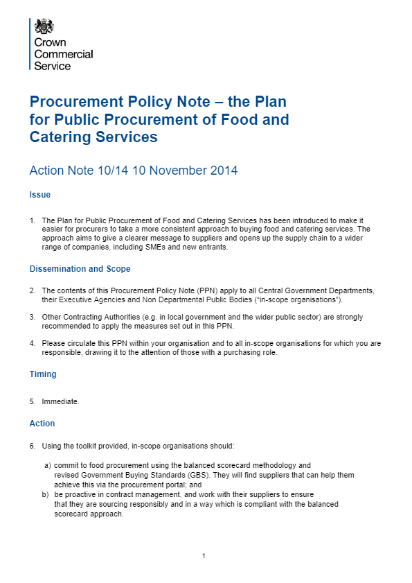 This is the most recent Procurement Policy Note (PPN 10/14) to be issued by the Cabinet Office which outlines the Plan for Public Procurement of Food and Catering Services.