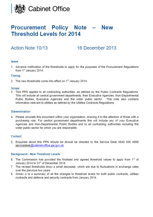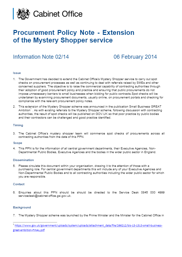 This is the most recent Procurement Policy Notes (PPN 02/14) to be issued by the Cabinet Office which outlines Extension of the Mystery Shopper service.