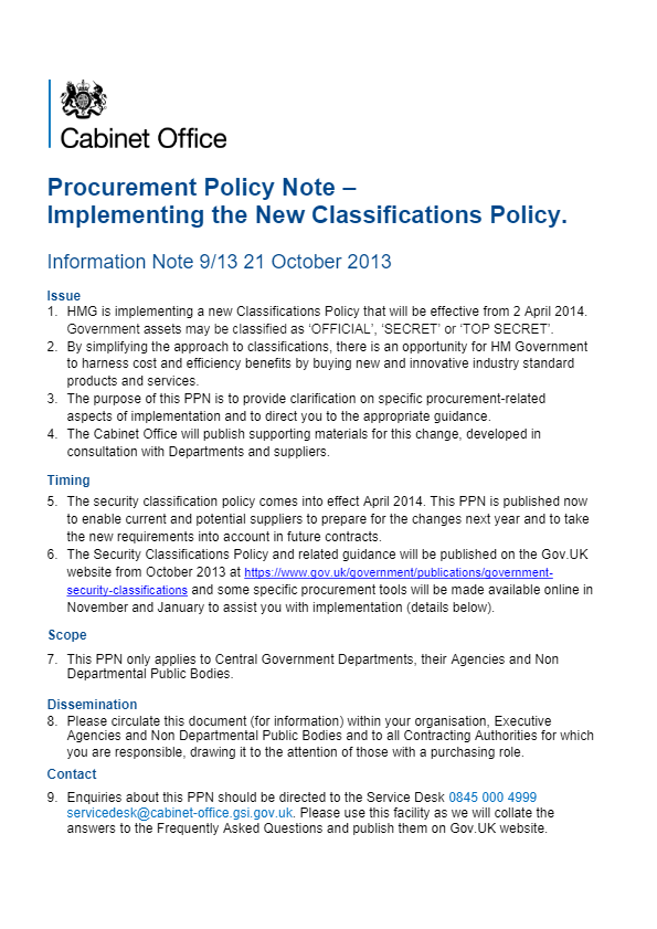 This is the most recent Procurement Policy Notice (PPN 9/13) to be issued by the Cabinet Office which outlines implementing the new classification policy.