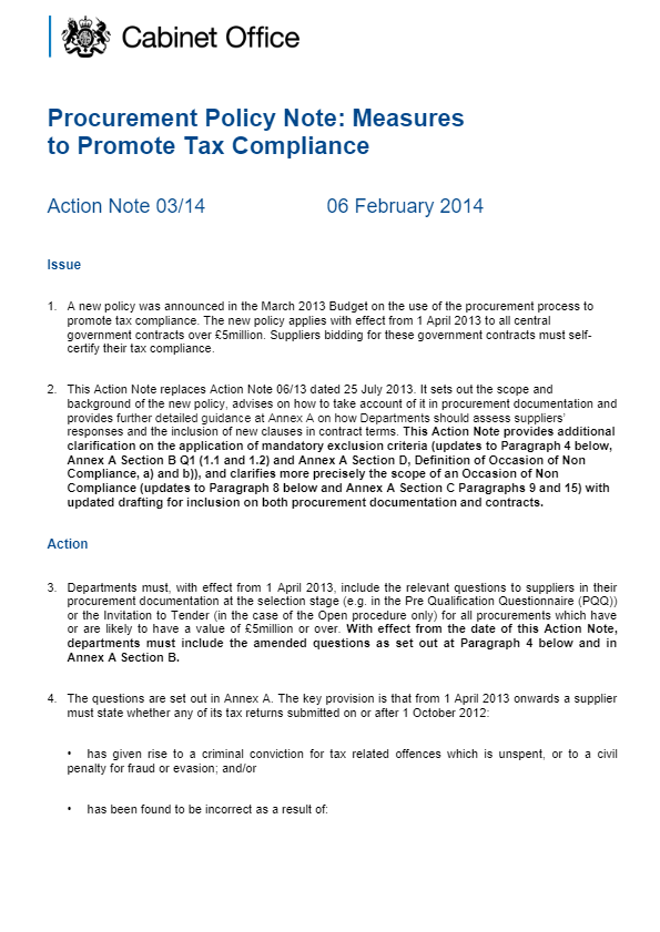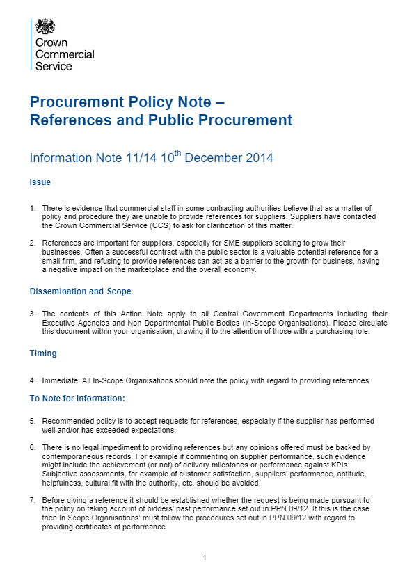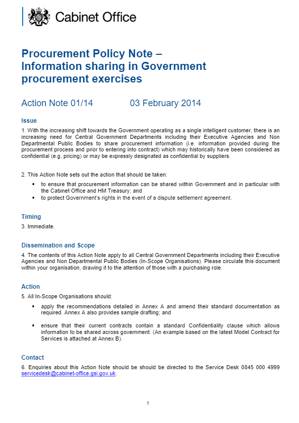 This is the most recent Procurement Policy Notes (PPN 01/14) to be issued by the Cabinet Office which outlines Information sharing in Government procurement exercises.