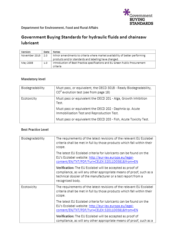 Government Buying Standards for Hydraulic Fluids and Chainsaw Lubricant