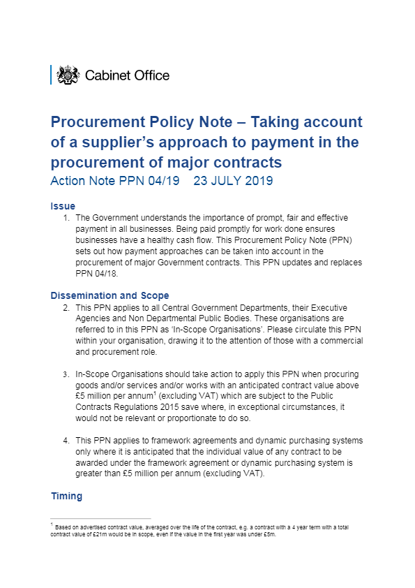 Procurement Policy Note – Taking account of a supplier’s approach to payment in the procurement of major contracts