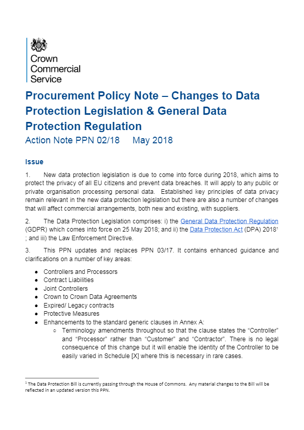 Procurement Policy Note – Changes to Data Protection Legislation & General Data Protection Regulation