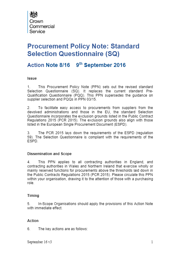 Procurement Policy Note: Standard Selection Questionnaire (SQ)