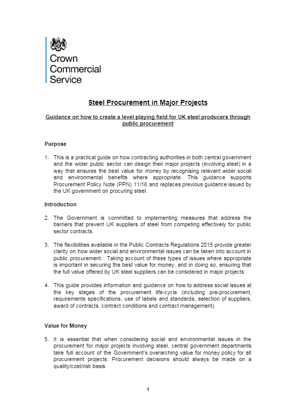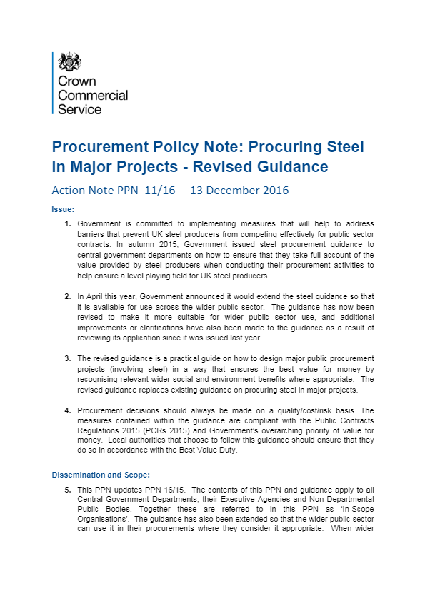 Guidance on how to create a level playing field for UK steel producers through public procurement. This is a practical guide on how contracting authorities in both central government and the wider public sector can design their major projects (involving steel) in a way that ensures the best value for money by recognising relevant wider social and environmental benefits where appropriate. This guidance supports Procurement Policy Note (PPN) 11/16 and replaces previous guidance issued by the UK government on procuring steel.