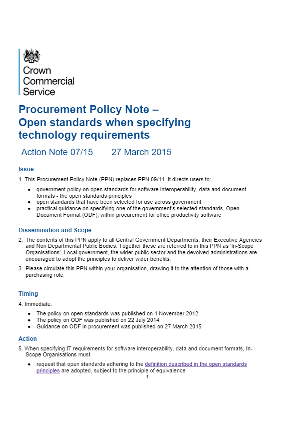 This is the most recent Procurement Policy Note (PPN 07/15) to be issued by the Cabinet Office which outlines open standards when specifying technology requirements.
