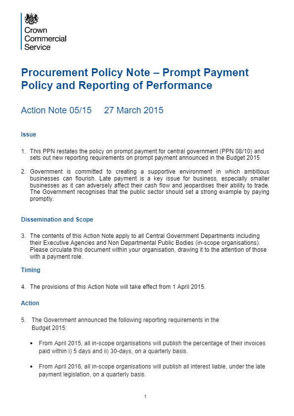 This is the most recent Procurement Policy Note (PPN 05/15) to be issued by the Cabinet Office which outlines Prompt Payment Policy and Reporting of Performance.