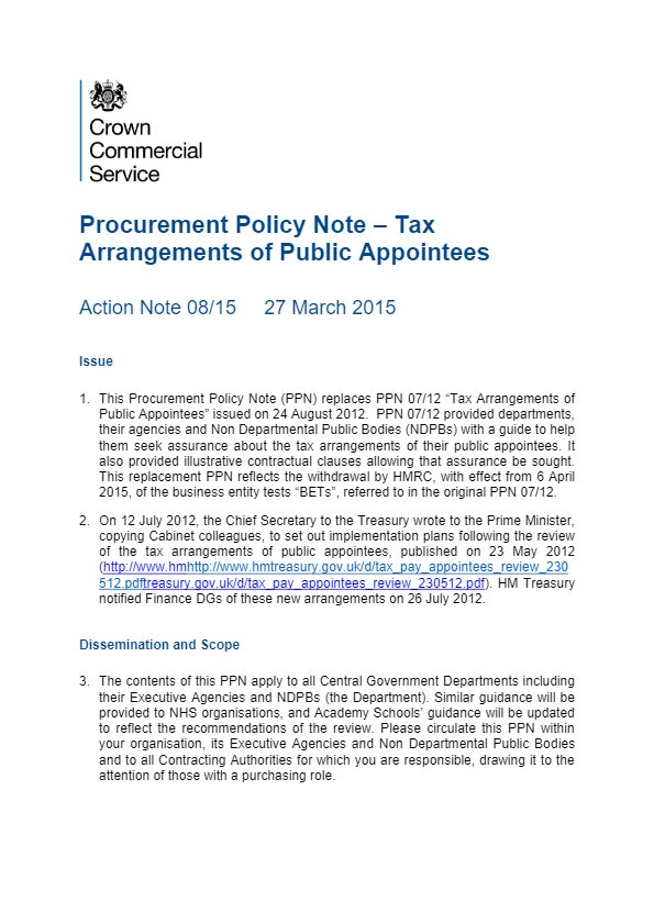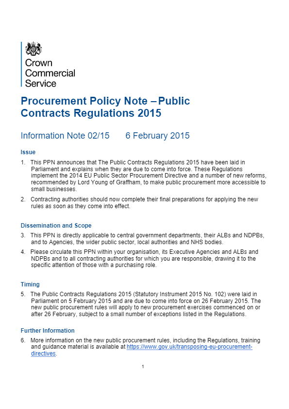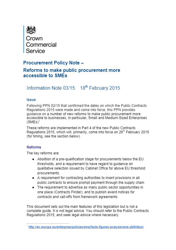 This is the most recent Procurement Policy Note (PPN 03/15) to be issued by the Cabinet Office which outlines Reforms to make public procurement more accessible to SMEs