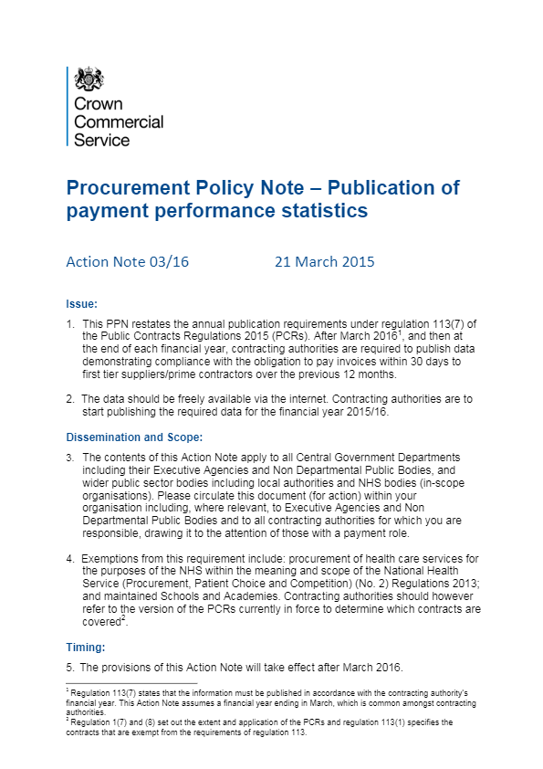 This is the most recent Procurement Policy Note (PPN 03/16) to be issued by the Cabinet Office which outlines Publication of payment performance statistics.